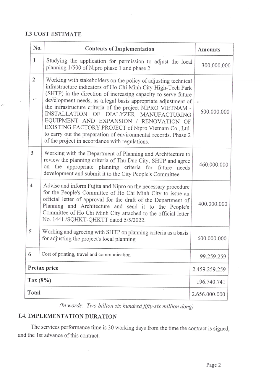 Legal Support Services Of Nipro Vietnam - Installation Of Dialyzer Manufacturing Equipment And Expansion/renovation Of Existing Factory Project