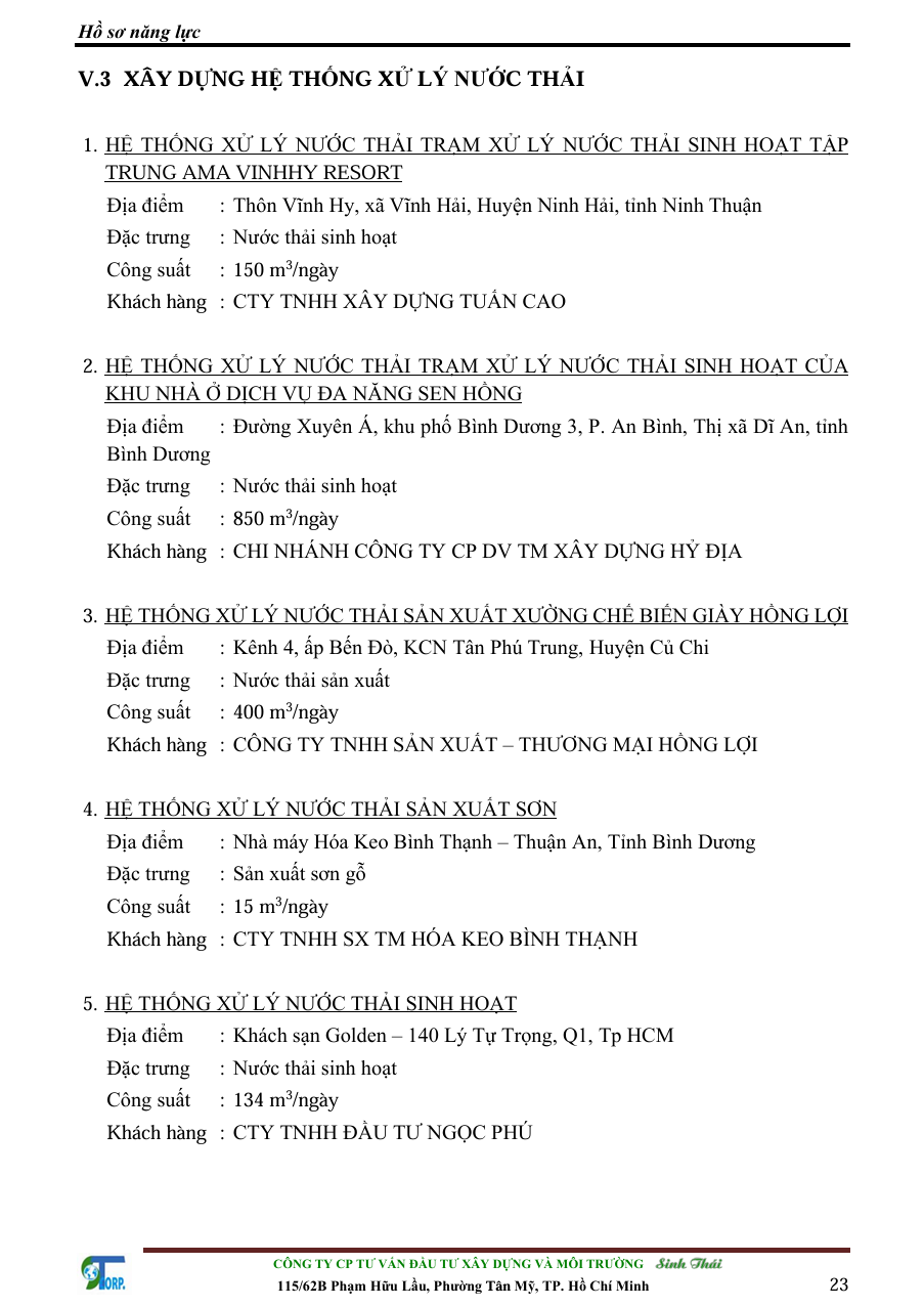 CÁC DỰ ÁN DỊCH VỤ VỀ THIẾT KẾ VÀ THI CÔNG HỆ THỐNG XỬ LÝ MÀ CHÚNG TÔI ĐÃ THỰC HIỆN TRONG NHỮNG NĂM QUA